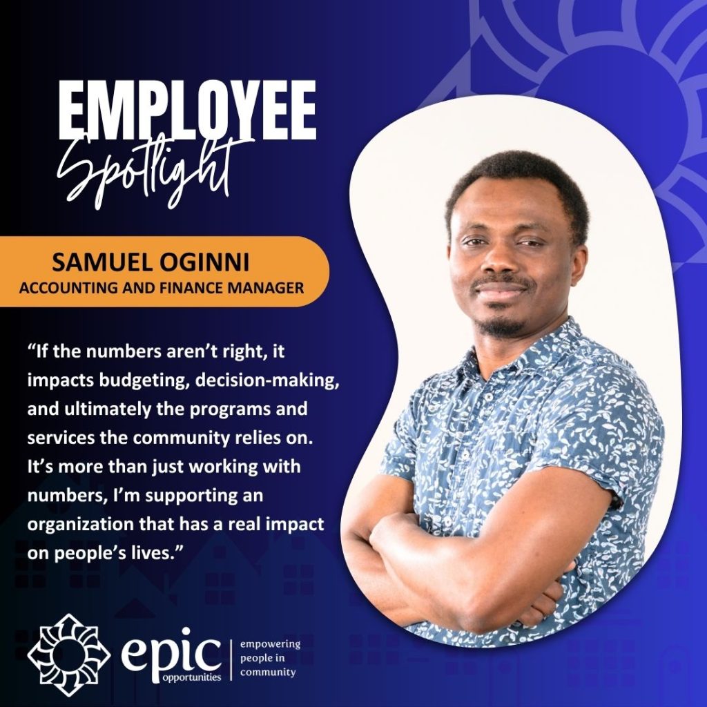 Meet Samuel Oginni! As we celebrate Administrative Professionals Day this week, we wanted to spotlight Sam, the Accounting and Finance Manager for Epic Opportunities! Sam has been a positive and effective presence from day one. His calm and pleasant demeanor, coupled with his diligence and competence, has made him a highly valued member of the administrative team, and he is a great “values” match for the organization as a whole.